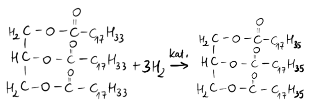 W tym zadaniu należy podać równanie reakcji utwardzania dla oleju roślinnego.