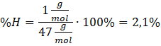 Skład procentowy pierwiastka w związku chemicznym można obliczyć dzieląc iloczyn ilości atomów pierwiastka i jego masy molowej przez masę molową całego związku chemicznego. Następnie wynik mnoży się przez 100%.