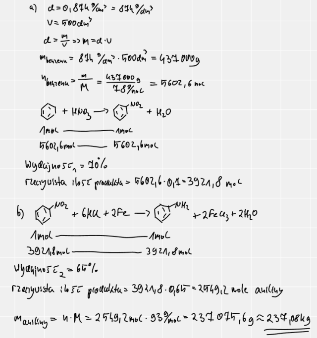W tym zadaniu musisz obliczyć masę aniliny, jaką można otrzymać z 500 dm³ benzenu (gęstość benzenu d = 0,874 g/cm3), w wyniku jego nitrowania, a następnie redukcji za pomocą żelaza i kwasu chlorowodorowego.
