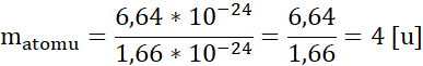 W celu obliczenia masy atomowej w unitach podziel masę atomu w gramach przez liczbę gramów, przypadającą na jeden unit. Wtedy wynik wyjdzie w unitach (obliczasz, ile unitów mieści się w danej masie substancji).