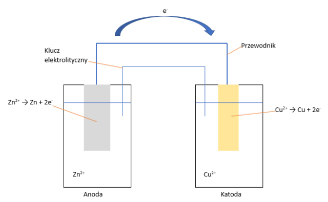 W tym zadaniu musisz narysować ogniwo Daniella i oznaczyć na rysunku: anodę (A), katodę (K), przewodnik, klucz elektrolityczny, kierunek przepływu elektronów, roztwory elektrolitów CuSO4 i ZnSO4.