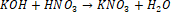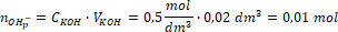 Na bazie równania reakcji widzimy, że wodorotlenek potasu i kwas azotowy(V) reagują w stosunku 1:1, dlatego liczba moli jonów OH- będzie równa liczba moli jonów H+.