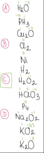 W przypadku podpunktu C, tlen w nadtlenku wodoru może się utlenić do stopnia utlenienia 0 i zredukować do -II, chlor w kwasie chlorowym (V) może się zredukować do chloru na -I, 0, I, III stopnia utlenienia, a utlenić do stopnia +VII, zaś fosfor może się zredukować do stopnia -III lub utlenić do stopni III, V.