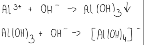 Probówka I- wodorotlenek glinu ma właściwości amfoteryczne, co oznacza, że jest ciałem stałym ulegającym roztworzeniu w kontakcie z mocnym kwasem czy zasadą, z utworzeniem klarownego roztworu. W reakcji z nadmiarem zasady wodorotlenek glinu ulega owemu rozpuszczeniu: