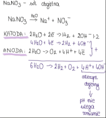 Zanotuj w zeszycie równania reakcji zachodzących na elektrodach podczas elektrolizy wodnego roztworu azotanu sodu, a następnie zdecyduj, czy w trakcie procesu pH elektrolitu się zmieni.
