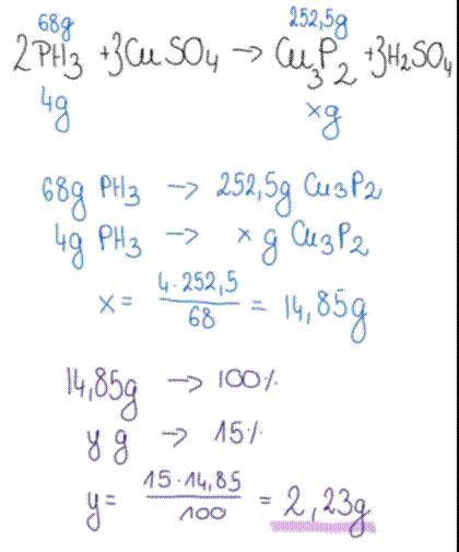 Wyznacz, jaka masa osadu (w gramach) utworzy się podczas reakcji 4,00 g fosforowodoru z siarczanem(VI) miedzi(II), zakładając, że wydajność procesu wynosi 15 procent, a wynik zaokrąglij do dwóch miejsc po przecinku.