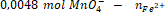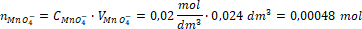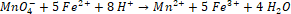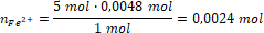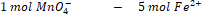 Na bazie równania reakcji widzimy, że 1 mol jonów MnO4- ulega reakcji z 5 molami jonów Fe2+. Możemy więc obliczyć liczbę moli żelaza(II):