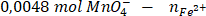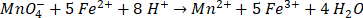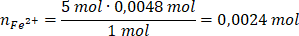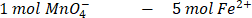 Na bazie równania reakcji widzimy, że 1 mol jonów MnO4- ulega reakcji z 5 molami jonów Fe2+. Możemy więc obliczyć liczbę moli żelaza(II):