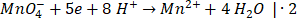 Mangan jest utleniaczem, ponieważ redukuje się z +VII do +II stopnia utlenienia, natomiast tlen jest reduktorem i utlenia się z –I do 0 stopnia utlenienia.