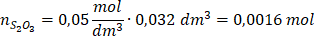 Bazując na równaniu reakcji można zauważyć z 1 mol jodu reaguje z 1 molem jonów tiosiarczanowych(VI), więc liczba moli jodu odpowiada liczbie moli S2O32-.