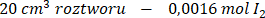 Obliczmy liczbę moli jodu w naszym 100 cm3 roztworze: