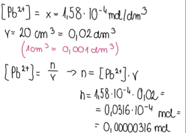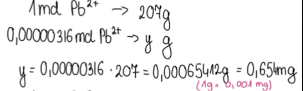 5. Obliczamy liczbę moli jonów Pb2+ w zadanej objętości roztworu, a następnie przeliczamy owe mole na masę: