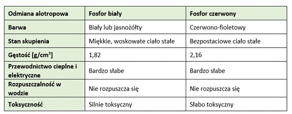 Fosfor występuje w kilku odmianach alotropowych. Wyróżniamy fosfor biały, czerwony, fioletowy i czarny. Wszystkie te odmiany znacząco różnią się między sobą. Fosfor biały to miękkie woskowate ciało stałe o białym lub jasnożółtym zabarwieniu. Natomiast fosfor czerwony to bezpostaciowe ciało stało w czerwono-fioletowym kolorze. Różnice możemy zaobserwować również we właściwościach chemicznych i fizycznych.