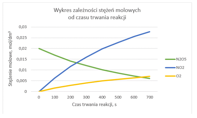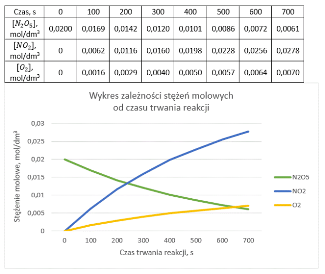 Zgodnie z równaniem reakcji stosunek molowy N2O5 do NO₂ wynosi 1:2, natomiast NO2 do O2 wynosi 2:1. Na tej podstawie można wywnioskować, że stężenie NO2 w danej chwili będzie dwukrotnie wyższe od stężenia N2O5, które uległo reakcji. Natomiast stężenie O2 będzie dwukrotnie niższe.