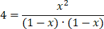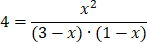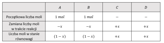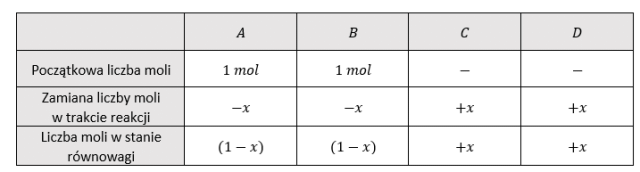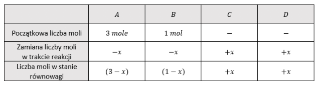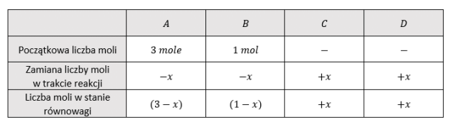 Korzystając z danych zawartych w tabeli, podstawiamy liczbę moli poszczególnych reagentów do wyrażenia na stałą równowagi: