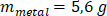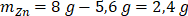 Mosiądz jest stopem cynku z miedzią. Wiemy, że miedź nie ulega reakcji roztwarzania z kwasem solnym, a więc w podanej reakcji to cynk będzie reagował z kwasem solnym. W wyniku reakcji wydzieliło się 5,6 g metalu, czyli miedzi, która nie uległa reakcji. Obliczamy masę cynku: