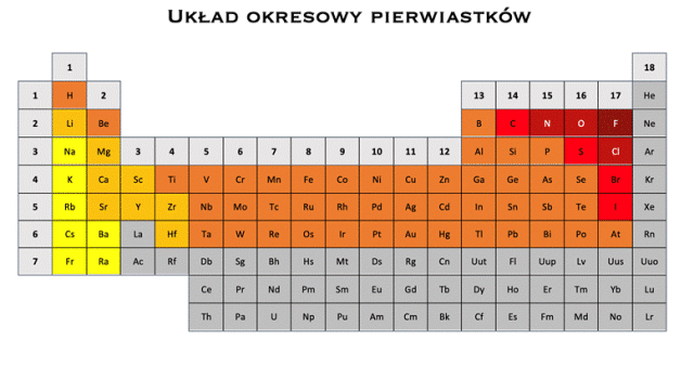 Pierwiastek o najmniejszej elektroujemności zaznaczony jest na jasnożółty. Jest to FRANS (