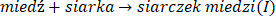 | Obserwacje | Pod wpływem oparów siarki drut miedziany rozżarzył się i sczerniał. Powstała substancja jest krucha i niepodobna do miedzi. |