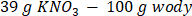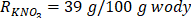 Na podstawie definicji rozpuszczalności można przyjąć, że 39 g substancji (KNO3) nasyca 100 g rozpuszczalnika i daje nam 139 g roztworu nasyconego. Dla cukru jest to odpowiednio 210 g substancji na 100 g wody, czyli 310 g roztworu nasyconego.