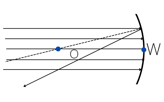 Punkt O będzie znajdować się 8 cm od zwierciadła (od wierzchołka W zwierciadła). Promień krzywizny to odległość od wierzchołka zwierciadła do środka krzywizny.