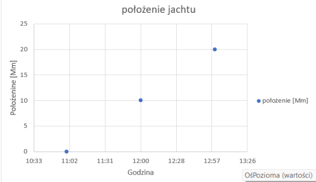 Gdzie znajduje się jacht o godzinie 12:00, jeśli między 11:00 a 13:00 porusza się ze stałą prędkością.