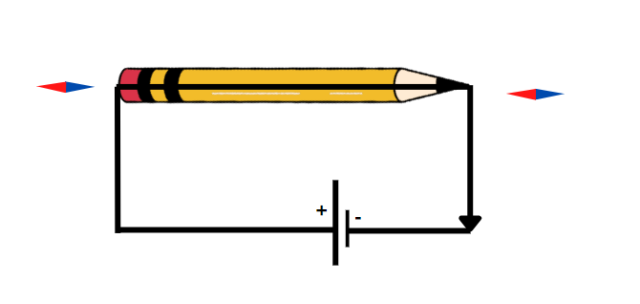 Zbuduj obwód w sposób pokazany na rysunku i zaznacz na obrazku, w którą stronę płynie prąd i zamaluj odpowiednio igły magnetyczne.