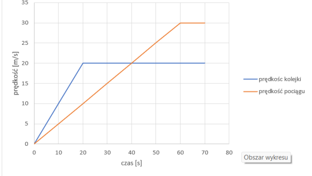 Kolejka osiąga prędkość podróżną po 20 s, a pociąg po 30 s. Jeśli oba środki lokomocji wyruszą jednocześnie do tego samego celu, najpierw na prowadzenie wysunie się kolejka. Jednak po 20 s od chwili startu prędkość kolejki przestanie rosnąć, natomiast prędkość pociągu będzie nadal rosła. Po 60 s od chwili startu prędkości będą takie same. Od tego momentu pociąg zacznie doganiać kolejkę .