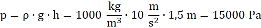 Ciśnienie wody na głębokości 1,5 m jest równe 15000 Pa.