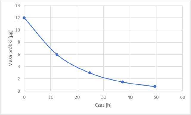 Wykres narysowano dla punktów odległych w czasie o czas połowicznego rozpadu. W każdym następnym punkcie masa próbki jest mniejsza o połowę.