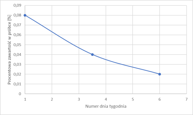 Wykres narysowano dla punktów odległych w czasie o czas połowicznego rozpadu. W każdym następnym punkcie masa próbki jest mniejsza o połowę.
