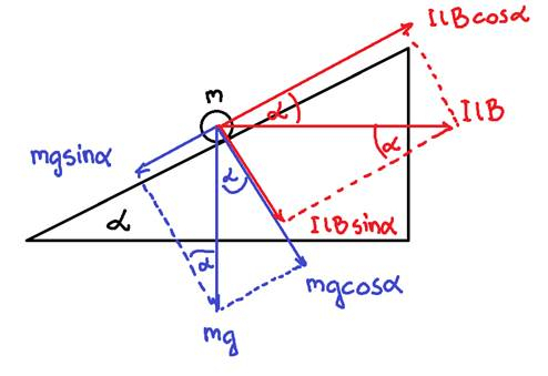 Jak wynika z rysunku, siła nacisku będzie sumaryczną siłą składowych prostopadłych do równi siły ciężkości i siły elektrodynamicznej.