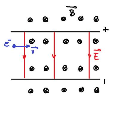 W tym zadaniu należy dorysować linie pola magnetycznego, tak aby elektron poruszał się jednostajnym ruchem prostoliniowym.
