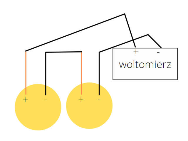Wbij do owocu po jednym gwoździu lub pręcie z aluminium i z miedzi. Podłącz do nich zaciski woltomierza w sposób pokazany w zad. 1. Włącz woltomierz i zmierz napięcie. Pamiętaj, by baterie podłączać przeciwnymi biegunami, a woltomierz z baterią – tymi samymi. Przewidywane napięcie baterii to napięcie jednego ogniwa pomnożone przez liczbę baterii. Zmierzone napięcie może nieco się różnić ze względu na niedokładność urządzeń czy straty napięcia podczas przepływu przez kabelki.