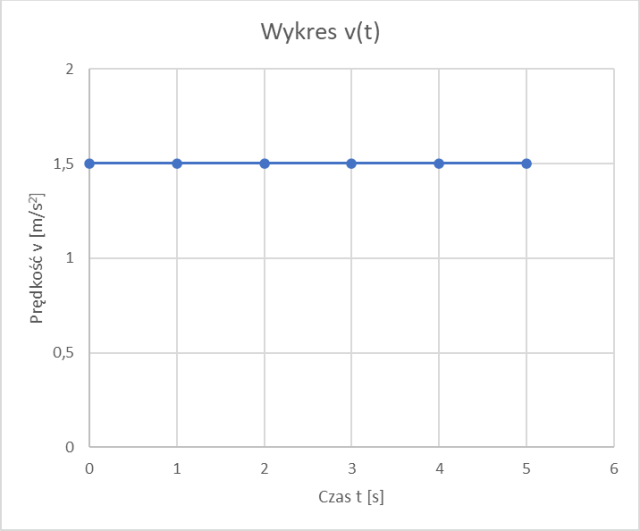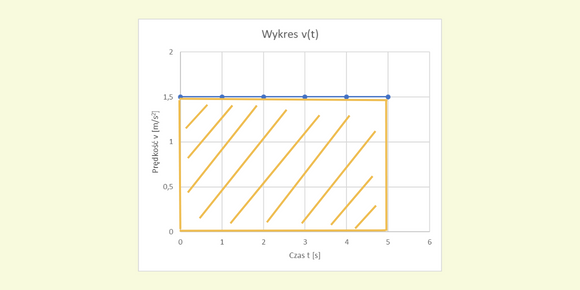 W tym zadaniu musisz narysować wykres prędkości od czasu dla rowerzysty poruszającego się 1,5 m/s. Oblicz drogę przejechaną w czasie 5 sekund i zaznacz ją na wykresie.