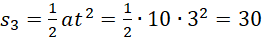 b) W czasie trzech pierwszych sekund samochód przejedzie 30, a w ciągu trzeciej sekundy 15.
