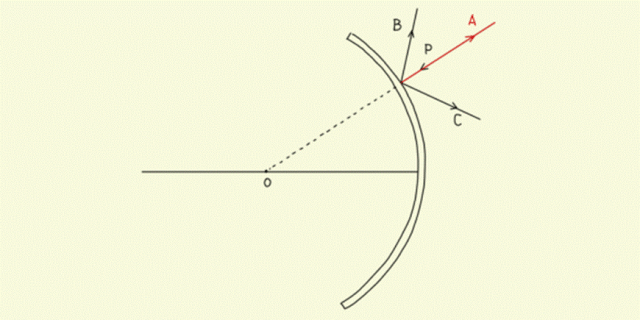 Promień pada na powierzchnię odbijającą zwierciadła wypukłego, w taki sposób, że jego przedłużenie przez środek krzywizny zwierciadła, więc po odbiciu promień biegnie w przeciwnym kierunku.