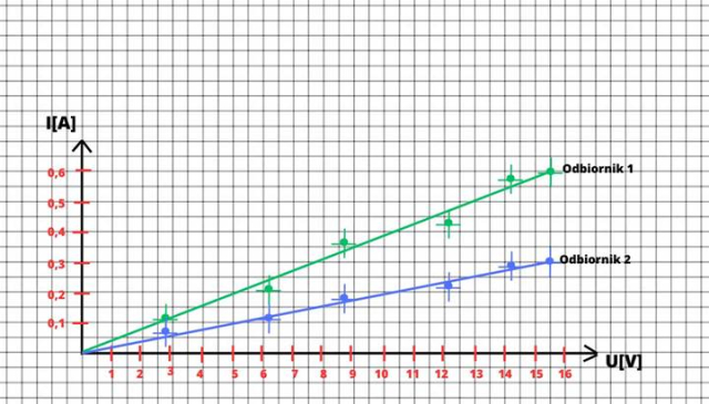 Należy odpowiednio dobrać skalę każdej z osi wykresu, zaznaczyć odpowiednie punkty i wokół każdego nanieść słupki niepewności dla osi U i I, a następnie dopasować prostą dla każdego odbiornika, która mieści się w słupkach niepewności.