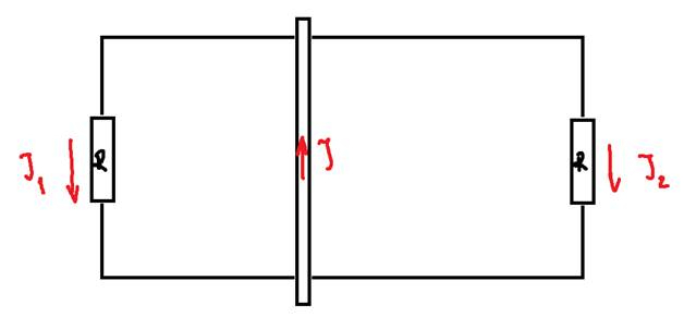 Kierunek przepływu prądu w poruszającym się w prawo pręcie przedstawiasię tak, ponieważ na to wskazuje reguła lewej dłoni (czyli determinuje to kierunek ruchu pręta i działające pole magnetyczne). Ponadto kierunek prądu w opornikach wynika już bezpośrednio z I prawa Kirchhoffa.
