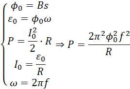 Zmiany w opisywanym układzie zachodzą sinusoidalnie, ale aby poznać dokładnie interesujące nas wartości, należy zająć się konkretami wśród tych zmian. Najprościej określić całokształt dla pewnych maksymalnych wartości, gdy strumień jest maksymalny, jest iloczynem indukcji i pola powierzchni, wówczas SEM indukcji też jest maksymalna i jest to iloczyn maksymalnego strumienia i częstości kołowej, która jest znowu iloczynem podwojonego pi i częstotliwości. Ponadto korzystamy z definicyjnej zależności na moc prądu oraz z prawa Ohma:
