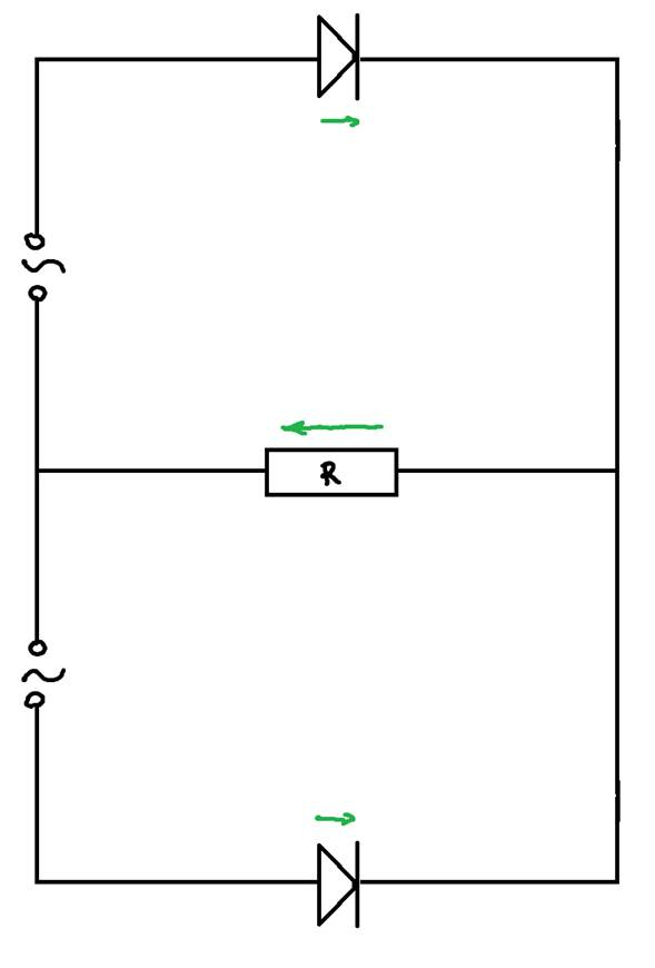Mamy dwa źródła i dwie diody, które wciąż blokują przepływ prądu przez połowę okresu.