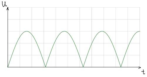 Diody podłączone w ten sposób pozwalają na ciągły przepływ prądu w ten sposób, że przez opornik płynie on w jednym kierunku, dlatego sinusoida napięcia znajduje się ponad pionową osią.