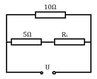 Teraz pozostaje nam już szeregowe połączenie oporu x z opornikiem 5Ω, czego wynikiem jest opór o wartości 10 Ω, który połączony jest z oporem na wyższej gałęzi, który również ma wartość 10 Ω.