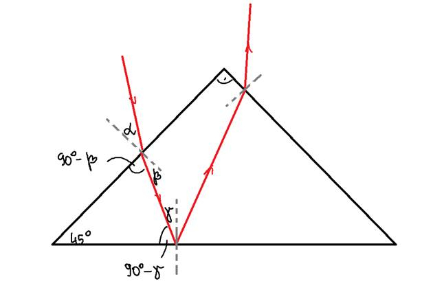 W tym zadaniu należy podać warunek dla sinα, przy którym na ścianie AC zaobserwujemy zjawisko całkowitego wewnętrznego odbicia.