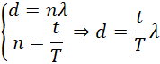 Szukana odległość d to długość fali λ pomnożona przez liczbę okresów, które upłynęły w czasie t, liczbę tych okresów oznaczam jako n i reprezentuję jako iloraz czasu t i okresu.