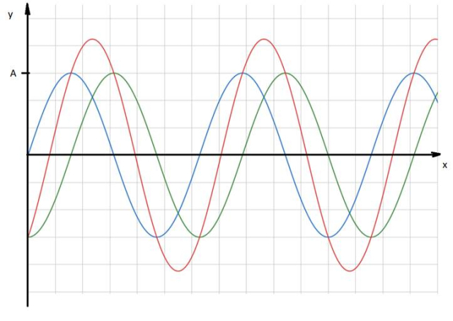 Czerwony wykres to efekt algebraicznej sumy wykresów funkcji niebieskiej i zielonej.
