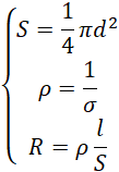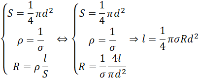 W zadaniu tym należy wyjść z faktu, że drut jest walcem o określonej objętości, determinującą długość. Z definicji wiemy, że opór właściwy jest odwrotnością przewodnictwa właściwego, natomiast pole przekroju poprzecznego walca (S) jest polem koła, natomiast promień jest połową średnicy.