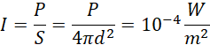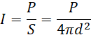 Licząc natężenie, korzystamy z zależności, że natężenie jest ilorazem mocy do powierzchni, gdzie powierzchnia jest kulista, zatem wzór przedstawia się następująco: