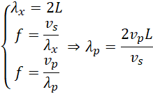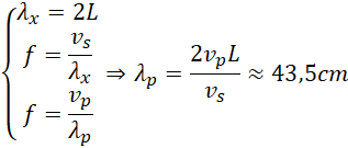 Długość fali w strunie jest równa podwojonej długości struny, częstotliwość fali reprezentujemy na dwa sposoby, jako iloraz prędkości dźwięku w strunie i długości fali w strunie oraz jako iloraz prędkości dźwięku w powietrzu i długości fali w powietrzu. Z tak otrzymanego układu otrzymujemy zależność opisującą długość fali w powietrzu (układ najlepiej rozwiązywać eliminując częstotliwość):