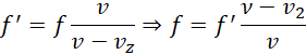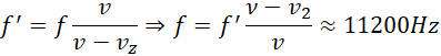 Górną granicę częstotliwości słyszanych przez człowieka oznaczam jako f’. Obserwator się nie porusza, zatem z definicji efektu Dopplera otrzymuję wzór: