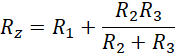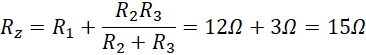 Liczymy opór zastępczy układu, patrząc na fakt, że układ oporników 2 i 3 jest równoległy, natomiast jest on szeregowy do opornika 1: